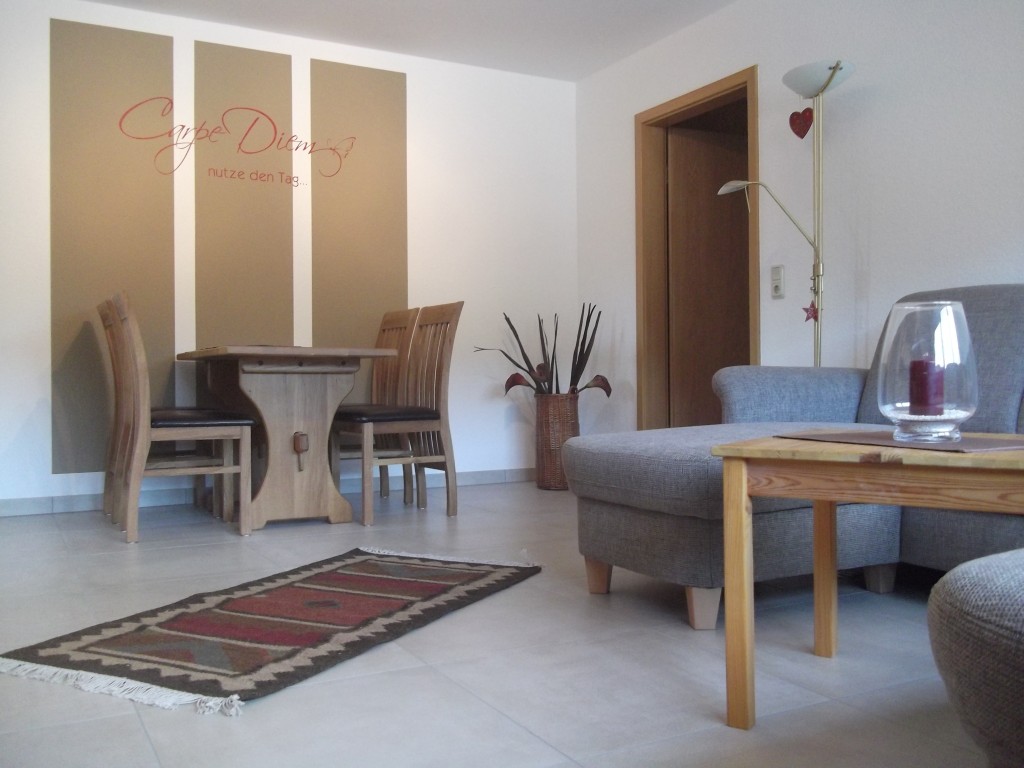 Im gemütlichen Wohn-Essbereich befindet sich eine ausziehbare Schlafcouch für eine Person und ein Esstisch der Platz für 4 Personen bietet.
