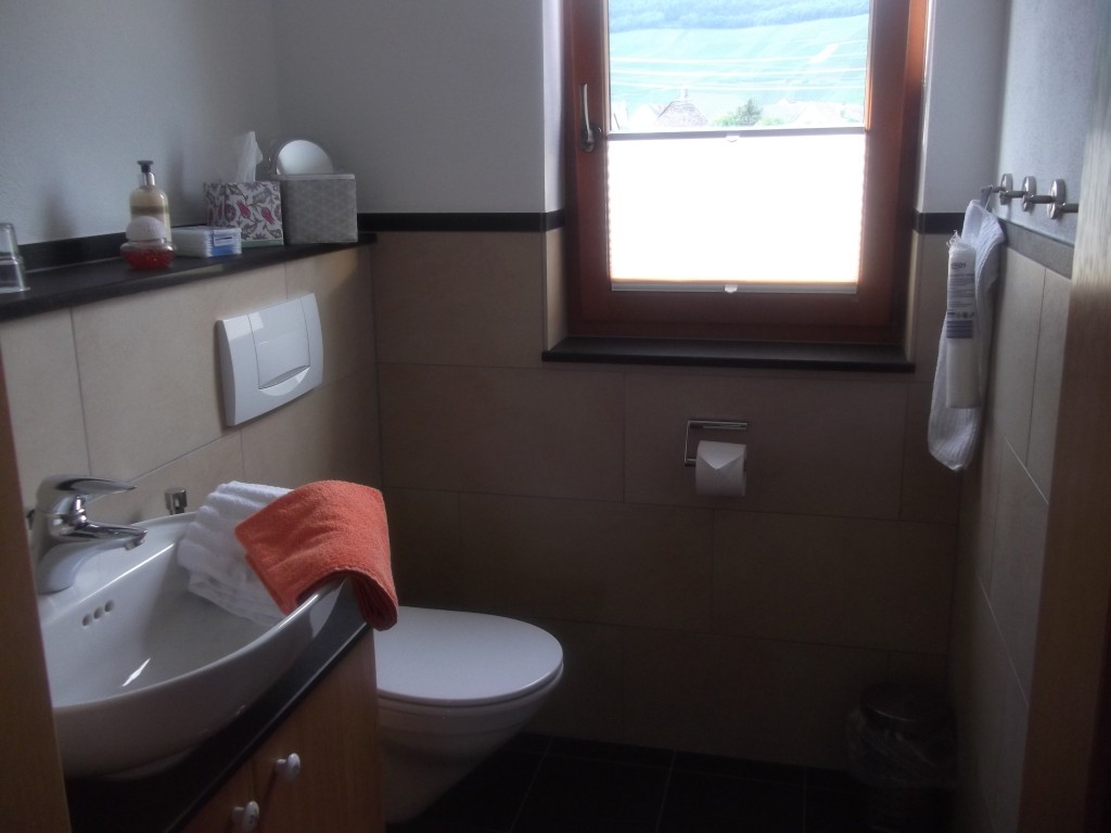 Das Tageslicht-WC bietet eine Toilette mit Waschtisch und ausreichend Ablagemöglichkeiten und Stauraum für Ihre Hygieneartikel.