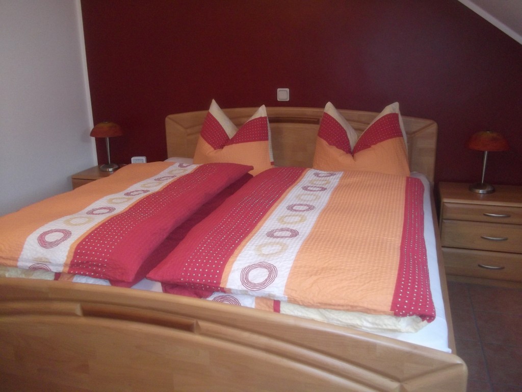 Das gemütliche Schlafzimmer bietet alles was man für eine erholsame Nacht braucht. Ein hochwertiges Bett mit 2 Nachtischen inkl. Lampen und einen geräumigen Kleiderschrank.